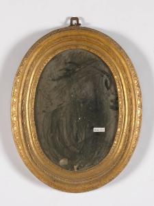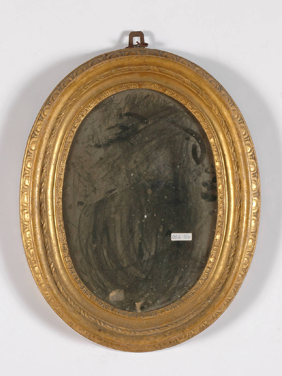 Cornice ovale dorata, montata a specchio con decorazione a intaglio.