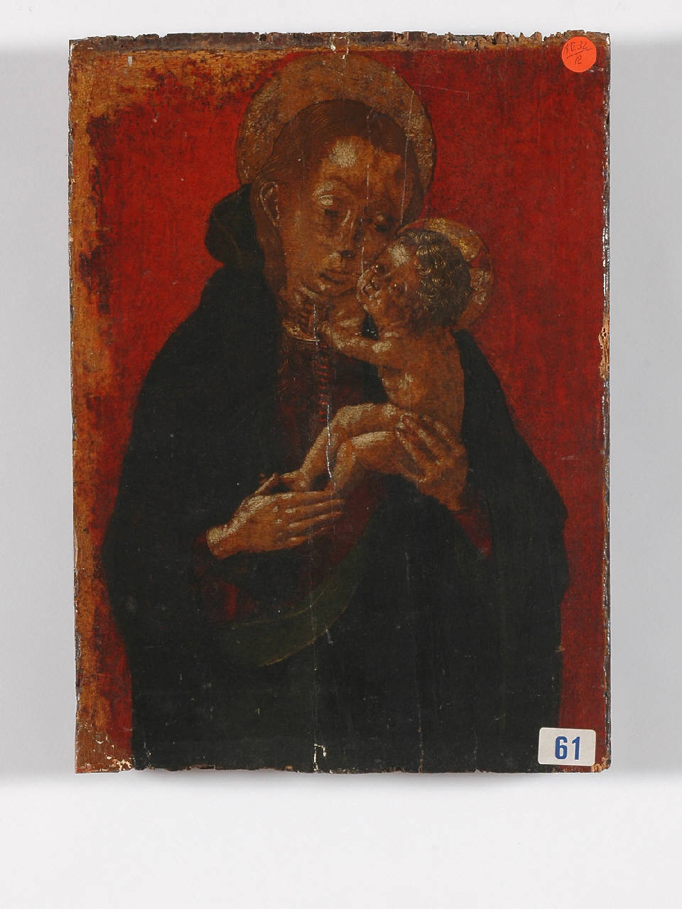 Dipinto di carattere devozionale privo di cornice raffigurante Madonna con Bambino. Dal fondo rosso scuro, privo di ogni elemento che potrebbe distogliere l'attenzione dell'osservatore dai personaggi rappresentati, emergono le figure della Madonna e di Gesù Bambino, con incarnati scuri, dal carattere quasi scultoreo. La tonalità generale del dipinto risulta molto cupa; effetti di luce e ombra ottenuti con l'utilizzo di tonalità chiare di colore.
