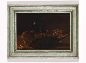 Dipinto inserito in una semplice cornice di legno verniciato, di moderna fattura, raffigurante una natura morta con cicala di mare. Dal fondo scuro, in cui si scorge a fatica una bottiglia e un bicchiere, emerge in primo piano la cicala di mare posta su un piano d'appoggio. La luce, proveniente da più parti, crea contrasti chiaroscurali che mettono in evidenza il naturalismo del soggetto raffigurato e sottolineano la trasparenza e la freddezza del vetro; predominano tonalità calde di colore.