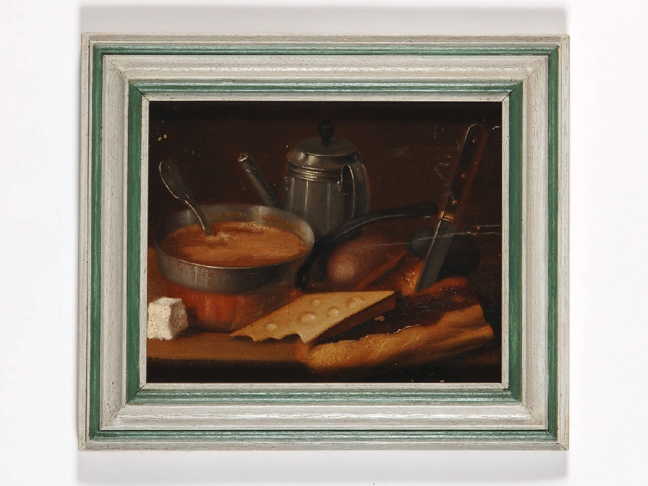 Dipinto inserito in una semplice cornice di legno verniciato, di moderna fattura, raffigurante una natura morta con formaggio e stoviglie da cucina. Dal fondo scuro emergono in primo piano i vari elementi che costituiscono la composizione. La luce, proveniente da sinistra, crea contrasti chiaroscurali che mettono in evidenza il naturalismo del soggetto raffigurato e sottolineano la freddezza e il tono metallico di alcuni utensili; predominano tonalità calde di colore.
