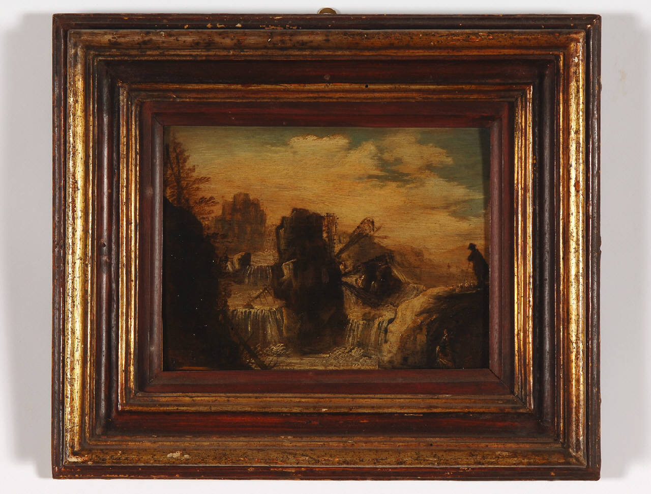 Dipinto inserito in una cornice di legno modanato, dorato e verniciato, raffigurante un paesaggio. Lo sfondo è dato da montagne che all'orizzonte sfumano confondendosi con il cielo soprastante carico di nubi. L'aspetto impetuoso, spumeggiante dell'acqua delle cascate che scendono dalle montagne è evidenziato dalla luce e dai tocchi veloci di colore. All'estrema destra compare la sagoma di una figura maschile in atteggiamento riflessivo e nello stesso tempo contemplativo rivolto al paesaggio che lo circonda. Predominano tonalità cupe e calde di colore; ricerca dell'umidità atmosferica che pervade l'intero paesaggio rappresentato.