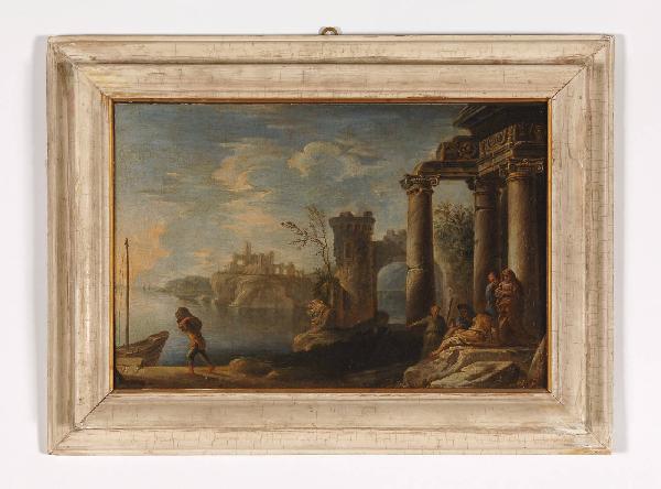 Dipinto inserito in una semplice cornice di legno verniciato con profilo dorato, raffigurante un capriccio con rovine. Lo sfondo è dato da armonici declivi rocciosi con ruderi di edifici classici; all'estrema sinistra lo specchio d'acqua tende a confondersi, a uniformarsi con il cielo soprastante che diventa sempre più luminoso all'orizzonte. In primo piano, all'estrema destra, altri resti di edifici di fantasia, sempre di impronta classicheggiante. Il paesaggio è animato in primo piano dalla presenza di figure, sia maschili che femminili, panneggiate all'antica, raffigurate in diversi atteggiamenti umani. Contrasti tra tonalità calde e tonalità fredde di colore; un colore che steso a macchie, definisce insieme alla luce, i vari elementi presenti nel dipinto e l'effetto atmosferico, dato da una diffusa umidità.