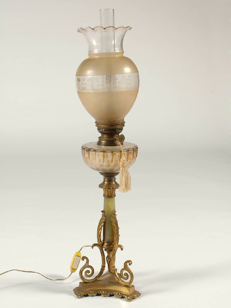 Lampada ad olio successivamente elettrificata in tempi recenti. Basamento in bronzo con motivi decorativi a racemi; fusto in onice. Canula in vetro e paralume in vetro satinato con motivi decorativi floreali stilizzati.