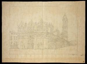 Progetto di restauro della cattedrale di Ferrara, a matita su carta bianca spessa. Riquadrato a matita.