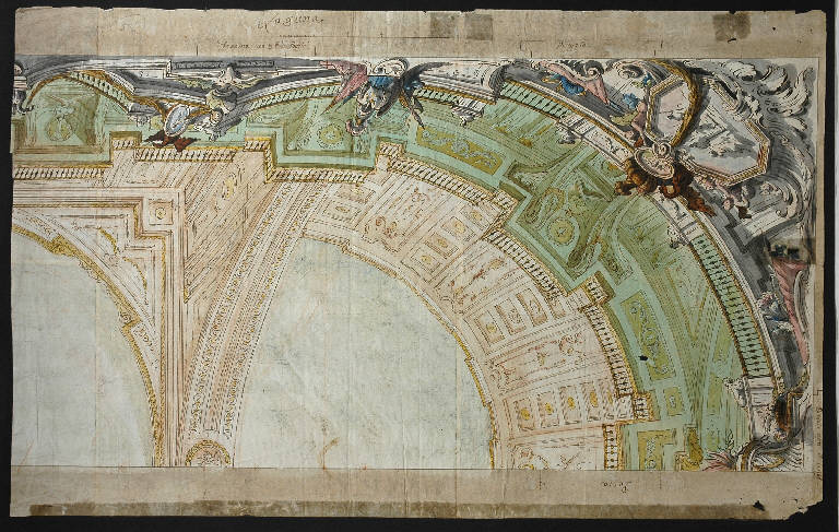 - NOTIZIE STORICO CRITICHE Una foto del disegno, non datata (negativo Perotti 23031) è conservata nell'album Lampugnani "Foto Dis. 1"; altre foto, non datate, si trovano nell'album D. 11; accanto a queste, Riccardo Lampugnani ha annotato il nome di Giambattista Tiepolo, ripetuto poi sul cartoncino di supporto e affiancato da una proposta di confronto con un disegno pubblicato da A. Bettagno (cat. n° 84, in "Disegni veneti del Settecento della Fondazione Cini e delle raccolte venete", Venezia 1963). Un secondo appunto del collezionista, posto sul cartoncino di supporto, sposta l'ipotesi di attribuzione verso Mengozzi Colonna, noto specialista di quadrature e collaboratore fedele di Tiepolo. L'accostamento, tuttavia, non è convincente: non ha infatti molto in comune, mi sembra, questo raffinato studio di volta, complesso di struttura e finemente ornato di motivi decorativi, con le aeree e lievi cornici che Mengozzi Colonna disegna per accompagnare le scene fastose di Giambattista Tiepolo. Il foglio della collezione Lampugnani è, a mio avviso, assai più vicino alle invenzioni dei decoratori bolognesi attivi negli ultimi decenni del XVIII secolo: per la matrice nettamente bibienesca, ancora, della soluzione architettonica; e per l'eleganza dei dettagli d'ornato, delicatamente in bilico tra barocchetto e neoclassicismo; si vedano, ad esempio, per confronto, le quadrature disegnate da Serafino Barozzi (Bologna 1735-1810) attorno al 1770, per la casa Gini, poi Veronesi, di Bologna, o per la villa Bovio Silvestri, verso il 1790 (cfr. A.M. Matteucci "I decoratori di formazione bolognese tra Settecento e Ottocento. Da Mauro Tesi ad Antonio Basoli", Milano 2003, p. 22, n°10, e pp. 334-335).