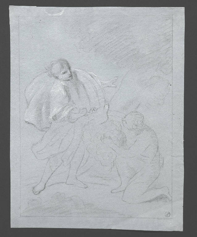- NOTIZIE STORICO CRITICHE Questa scena mitologica, di difficile lettura, sembra assai vicina, per tecnica e stile, al foglio con "Mercurio uccide Argo" (inv. 5108), che una scritta antica assegna al pittore friulano Jacopo D'Andrea (Rauscedo, Pordenone 1819 - Venezia 1906): è identico, infatti, il segno veloce, ma un po' greve, della matita nera; identico l'uso del gesso bianco, steso a illuminare forme larghe e morbide, ora a tocchi densi, ora a tratti rapidi e nervosi; identico il modo di marcare, sui volti, brevi tratti orizzontali, o punti, a indicare rapidamente occhi, naso e bocca dei personaggi; ed è identico, infine, l'uso della carta preparata ad acquerello grigio/ azzurro. I pochi disegni noti del pittore friulano non consentono, tuttavia, di confermare con certezza l'attribuzione.