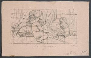 • NOTIZIE STORICO CRITICHE Questo piccolo foglio appartiene ad un ampio gruppo di disegni che alcune scritte, poste per lo più sui cartoncini di supporto, attribuiscono genericamente ai "Morgari": il riferimento è alla nota dinastia di pittori piemontesi che lavora intensamente a Torino e nell'intero Piemonte per tutto il XIX secolo e parte del XX. Questa piccola scena, un po' leziosa, è firmata "L. Morgari": si tratta certamente di Luigi Morgari (Torino 1857 - 1935), figlio di Paolo Emilio, conosciuto soprattutto per la sua vasta produzione di carattere religioso, ma autore, talvolta, di decorazioni profane e di pittura di genere .