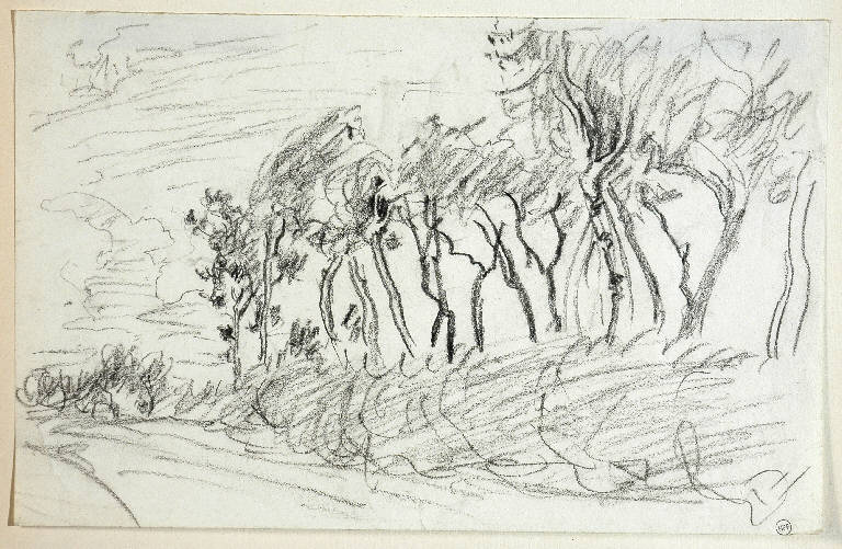 - NOTIZIE STORICO CRITICHE Il disegno fa parte di un insieme, con numeri di inventario da 5008 a 5026, conservati da Riccardo Lampugnani in una cartelletta di cartone con etichetta che reca l'iscrizione a penna "Luigi Bertelli 20 disegni originali" e, sempre a penna: "1852-1916, e altri". I disegni pevenuti al museo Poldi Pezzoli sono 19. Il disegno mancante è documentato da una foto nell'Album "D 15" e rappresenta una piccola figura femminile davanti a un albero. Nello stesso Album è conservata una foto in b/n del presente disegno. La datazione post quem proposta indica il periodo tardo dell'attività di Bertelli, caratterizzato dallo studio dal vero (prediletto dall'artista) del paesaggio reso con un tratto sintetico in una impaginazione di ampio respiro che spesso presenta un punto di vista lontano e rialzato.