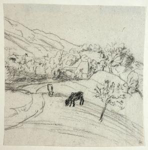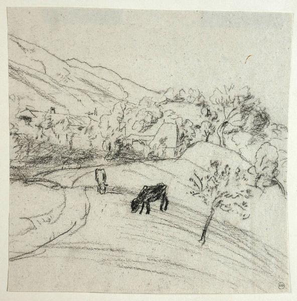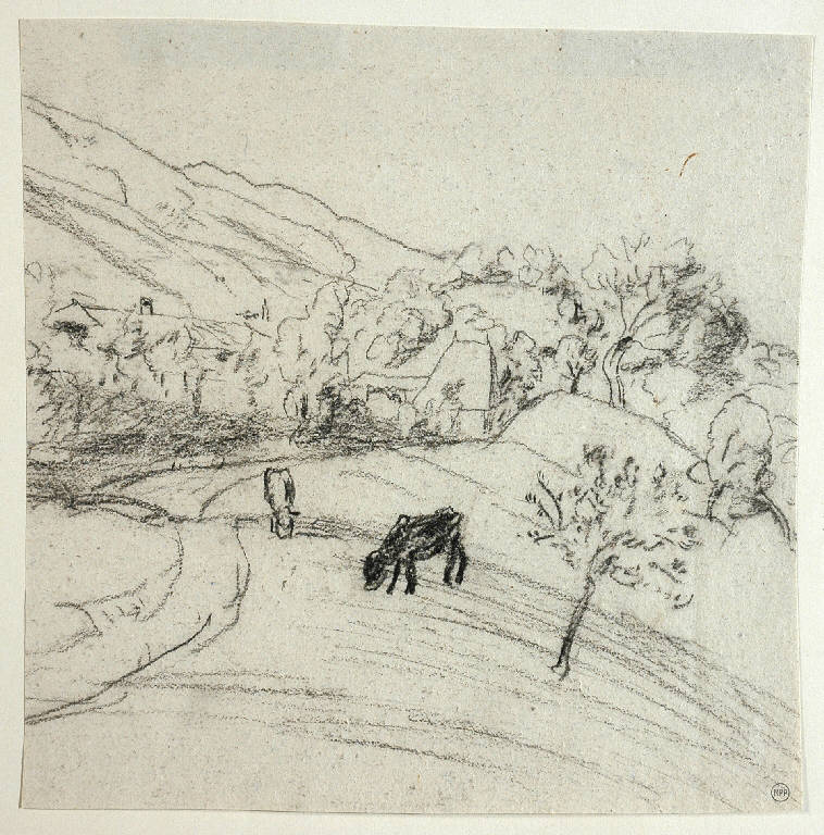 - NOTIZIE STORICO CRITICHE Il disegno fa parte di un insieme, con numeri di inventario da 5008 a 5026, conservati da Riccardo Lampugnani in una cartelletta di cartone con etichetta che reca l'iscrizione a penna "Luigi Bertelli 20 disegni originali" e, sempre a penna: "1852-1916, e altri". I disegni pevenuti al museo Poldi Pezzoli sono 19. Il disegno mancante è documentato da una foto nell'Album "D 15" e rappresenta una piccola figura femminile davanti a un albero. Nello stesso Album è conservata una foto in b/n del presente disegno. La datazione post quem proposta indica il periodo tardo dell'attività di Bertelli, caratterizzato dallo studio dal vero (prediletto dall'artista) del paesaggio reso con un tratto sintetico in una impaginazione di ampio respiro che spesso presenta un punto di vista lontano e rialzato.
