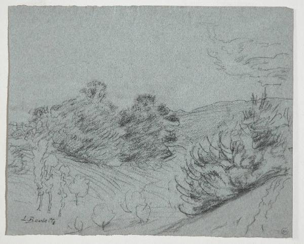 - NOTIZIE STORICO CRITICHE Il disegno fa parte di un insieme, con numeri di inventario da 5008 a 5026, conservati da Riccardo Lampugnani in una cartelletta di cartone con etichetta che reca l'iscrizione a penna "Luigi Bertelli 20 disegni originali" e, sempre a penna: "1852-1916, e altri". I disegni pevenuti al museo Poldi Pezzoli sono 19. Il disegno mancante è documentato da una foto nell'Album "D 15" e rappresenta una piccola figura femminile davanti a un albero. Nello stesso Album è conservata una foto in b/n del presente disegno (recto). La datazione post quem proposta indica il periodo tardo dell'attività di Bertelli, caratterizzato dallo studio dal vero (prediletto dall'artista) del paesaggio reso con un tratto sintetico in una impaginazione di ampio respiro che spesso presenta un punto di vista lontano e rialzato. Diversamente dagli altri disegni custoditi da Lampugnani nella cartelletta, con l'eccezione di quello con n. inv. 5009, questo è rifinito con maggiore accuratezza.