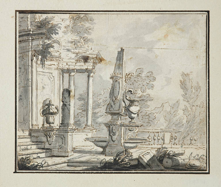 • NOTIZIE STORICO CRITICHE Riconducibile al genere del capriccio, in cui si assiste alla fusione tra la veduta reale ed il teatro, coltivato a Roma, Venezia e in Francia soprattutto a Parigi, dove uno dei massimi artefici fu L.J. Le Lorrain, che ne apprese i caratteri da Piranesi durante il soggiorno romano e ne divulgò l'opera (cfr. R. Gilli, Architettura e scenografia: disegni dal XVI al XX secolo, Milano 1984, n. 29). Un tratto veloce e sottile delinea questa piccola composizione con architetture in rovina, nella quale un obelisco con fontana funge da fulcro della composizione: attorno ad esso si dispone a sinistra un emiciclo con colonne, a destra si apre in uno sfondo di paesaggio dall'esuberante vegetazione, delimitata da una balaustrata. In primo piano vaghi cespugli, che si sono inseriti nelle pietre divelte, vengono lasciati in penombra esaltando la luminosità della scena.