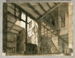 Scena raffigurante l'interno di un fienile. Interno