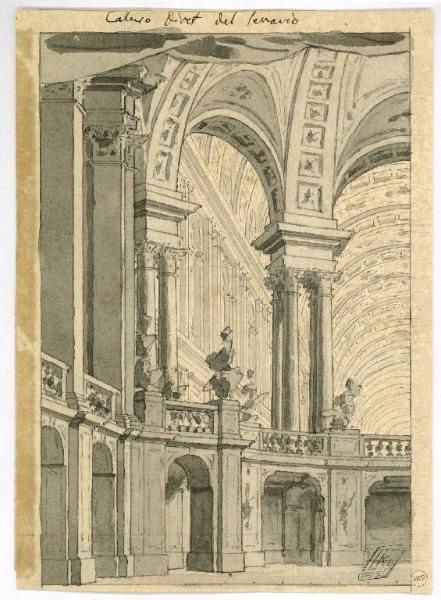 - NOTIZIE STORICO CRITICHE L'impostazione della mezza scena con la zona di portico sul quale si affaccia l'ariosa e agile loggia in cui sottarchi a cassettoni si alternano a volte scompartite da medaglioni, la disposizione dei vasi sulle balaustrate in funzione di raccordo tra i due piani, come pure il segno agile e preciso, l'acquarellatura fluida attestano il riferimento a Galliari documentato anche dall'iscrizione, relativa al direttore del Teatro Regio che compare sul disegno stesso. I contorni netti e precisi, la resa dei volumi accurata e la sobrietà della composizione potrebbero anche far pensare al fratello di Giuseppino, Giovannino (1746-1818), del quale si conservano numerosi disegni ai Musei Civici di Torino, alla Pinacoteca Civica di Bologna, al Museo Teatrale alla Scala di Milano ed a Brera, e del quale si segnala in particolare per le ananlogie, il disegno proveniente dalla Raccolta Dubini di Milano e ora al Museo Civico di Torino esposto nella mostra "Cultura figurativa e architettonica negli Stati del Re di Sardegna/ 1773 - 1861" come "Logge a vista del Tevere negli appartamenti di Vitellia (La clemenza di Tito, Teatro Regio 1798)" (n. 873 del catalogo). Il riferimento ai Galliari è confermato dalla Viale Ferrero, secondo quanto indicato dal collezionista Lampugnani che lo sottopose alla studiosa il 24/10/1969, come si ricava dall'iscrizione che compare nel supporto.