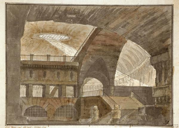 - NOTIZIE STORICO CRITICHE Questo interessante disegno della scenografo Luigi Tasca, che reca il riferimento autografo dell'artista con l'indicazione anche del Teatro per cui venne realizzato (l'Alibert di Roma), autore del quale si conoscono poche opere e che risulta operoso a Perugia e Livorno nel primo quarto del sec. XIX, denota nel soggetto rappresentato, un sotterraneo, l'evidente influsso delle carceri piranesiane, ma anche una resa precisa nella definizione dello spazio ed un'attenta ricerca luministica, con la fonte di luce che scende dall'apertura del soffitto a volta, che lo rendono sicuramente un'opera di qualità. Si possono confrontare in tal senso le incisioni, ricavate da disegni originali di Tasca, prodotte da Francesco Inghirami (Volterra 1772 - Fiesole 1846) conservate presso il Museo Teatrale alla Scala di Milano (n. 2996 del catalogo), che richiamano il soggetto qui proposto: a) Interno di edificio sepolcrale, b) Interno di edificio sacro, e) Esterno di edifico sepolcrale, f) Interno di carcere.