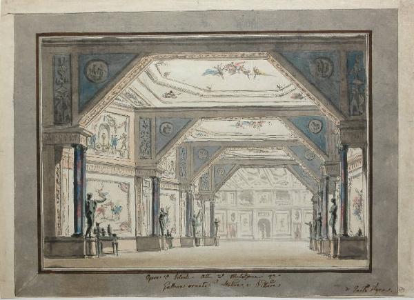 Scena raffigurante galleria ornata di statue e pitture. Interno