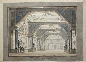 - NOTIZIE STORICO CRITICHE Il disegno si riferisce all'opera "Fetonte", ribattezzata per gli avvenuti mutamenti politici "I Veri Amici repubblicani", programmata per il 1799 al Teatro Regio di Torino, nominato quell'anno "Teatro Nazionale". E' stato presentato alla mostra torinese del 1980 come caso significativo del periodo di dominazione francese, durante il quale alcune opere teatrali programmate per quella stagione vennero riproposte con alcune modifiche per renderle più adatte alle esigenze del nuovo regime repubblicano (cfr. Viale Ferrero 1980, p. 812-3 e p. 1495; la Viale Ferrero lo segnala in "La scenografia dalle origini al 1936", in "Storia del Teatro Regio di Torino", 1980, p. 317-9, come Raccolta Lampugnani; nella cartellina che contiene il disegno vi è un appunto di Lampugnani che indica una segnalazione del 1979 della Viale stessa, compare inoltre la scheda del prestito alla mostra torinese, dalla quale risulta restituito il 9/10/1980).\nLa figura di Gaetano Vigna risulta poco nota. Incerta la data di nascita, come pure quella di morte. Dichiarato "avanti negli anni" nel 1819 (M. Paroletti, "Turin e ses curiosités", 1819, p. 414) potrebbe essere nato attorno al 1745-50 ca. Egli è attivo con il fratello Giacinto come decoratore di ambienti. C. Rovere, nella "Descrizione del Reale Palazzo di Torino" (Torino, 1858, p. 70) cita un Vigna tra i decoratori di Palazzo Reale a Torino nel tardo '700. Gli è riferita la decorazione di volte e pareti della chiesa di S. Michele a Centallo nel 1808. Entrambi i fratelli risultano scenografi del Teatro Regio di Torino per la stagione 1798/99, programmata dalla Società dei Cavalieri in epoca di ancien régime e svoltasi nel 1799 durante il periodo repubblicano.\nLe sue opere denotano una certa adesione al gusto classicista, che si rivela nella compostezza e regolarità delle sue composizioni, che viene definto dalla Viale Ferrero "galliaresco e tradizionale" (Viale Ferrero, Cultura figurativa ...1980, p. 813).