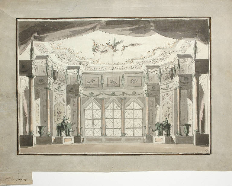 - NOTIZIE STORICO CRITICHE Il disegno si riferisce all'opera "Argea" (atto I, sc. 2) programmata per il 1799 al Teatro Regio di Torino, nominato quell'anno "Teatro Nazionale". E' stato presentato alla mostra torinese del 1980 come caso significativo del periodo di dominazione francese, durante il quale alcune opere teatrali programmate per quella stagione vennero riproposte con alcune modifiche per renderle più adatte alle esigenze del nuovo regime repubblicano (cfr. Viale Ferrero 1980, p. 812-3 e p. 1495; la Viale Ferrero lo segnala in "La scenografia dalle origini al 1936", in "Storia del Teatro Regio di Torino", 1980, p. 317-9, come Raccolta Lampugnani; nella cartellina che contiene il disegno vi è un appunto di Lampugnani che indica una segnalazione del 1979 della Viale stessa, compare inoltre la scheda del prestito alla mostra torinese, dalla quale risulta restituito il 9/10/1980).\nLa figura di Gaetano Vigna risulta poco nota. Incerta la data di nascita, come pure quella di morte. Dichiarato "avanti negli anni" nel 1819 (M. Paroletti, "Turin e ses curiosités", 1819, p. 414) potrebbe essere nato attorno al 1745-50 ca. Egli è attivo con il fratello Giacinto come decoratore di ambienti. C. Rovere, nella "Descrizione del Reale Palazzo di Torino" (Torino, 1858, p. 70) cita un Vigna tra i decoratori di Palazzo Reale a Torino nel tardo '700. Gli è riferita la decorazione di volte e pareti della chiesa di S. Michele a Centallo nel 1808. Entrambi i fratelli risultano scenografi del Teatro Regio di Torino per la stagione 1798/99, programmata dalla Società dei Cavalieri in epoca di ancien régime e svoltasi nel 1799 durante il periodo repubblicano.\nLe sue opere denotano una certa adesione al gusto classicista, che si rivela nella compostezza e regolarità delle sue composizioni, che viene definto dalla Viale Ferrero "galliaresco e tradizionale" (Viale Ferrero, Cultura figurativa ...1980, p. 813). La studiosa segnala inoltre che "La Sala per Argea fu eseguita, o rimaneggiata, dopo l'occupazione francese perchè in un fregio compaiono fasci, bipenni, e altri emblemi rivoluzionari".