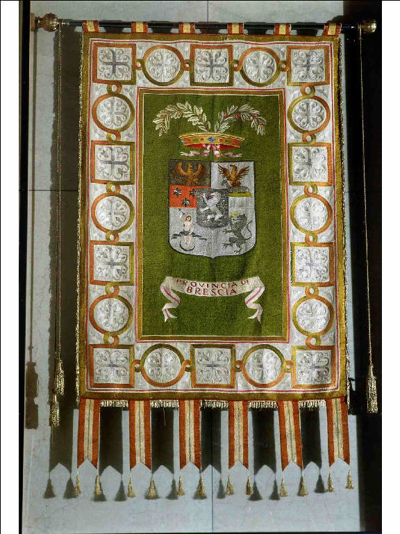 - NOTIZIE STORICO CRITICHE Lo stemma della Provincia di Brescia fu iscritto nel registro della Comunità araldica il 15 luglio del 1904 in seguito a un decreto firmato nel marzo di quello stesso anno, da Vittorio Emanuele III. Nel bozzetto allegato al decreto reale compare uno scudo variopinto contenente cinque stemmi: sono quelli della città di Brescia al centro e dei Comuni di Chiari, Breno, Verolanuova e Salò disposti ai quattro lati.