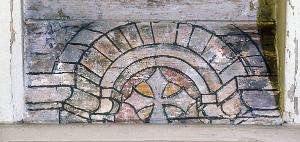 Tavoletta quadrangolare recante un arco a tutto sesto, sotto il quale si trova una croce aguzza.