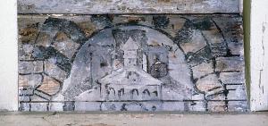 Tavoletta quadrangolare recante un arco a tutto sesto, sotto il quale si trova una chiesa.