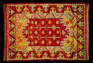 Tappeto a decorazione geometrica. Il tappeto, entrato a far parte della collezione museale come Shirvan, è riconducibile alle manifatture della città di Bergama. Infatti, molto caratteristici della zona sono proprio i tappeti decorati, come in questo caso, con impianto a doppia nicchia con il centro occupato da motivi geometrici e floreali molto stilizzati. \nQuesto tappeto è caratterizzato da una versione molto geometrizzata dell'antico impianto a doppia nicchia dei cosiddetti Transilvani del XVII secolo. Il campo è bordato da una cornice costituita da tre fasce affini a quelle dei tappeti caucasici. Quella più interna è decorata da fiori e foglie disposte in diagonale. La seconda, più larga, presenta elementi triangolari simili a punte di freccia. Il tappeto è chiuso da una minuta cornice con un motivo vicino al medachyl. \nLungo i lati corti è presente una fascia in tessuto di circa 5 cm. Decorata da strisce rosse e beige. Sul tappeto è presente un piccolo piombo di circa 6 mm. che reca l'iscrizione: "Istanbul *oda*" (si tratta probabilmente del piombo doganale dell'importazione).\nOrdito: lana, Trama: lana; Pelo: lana; Nodo: simmetrico; Densità: 1200 nodi al dm2