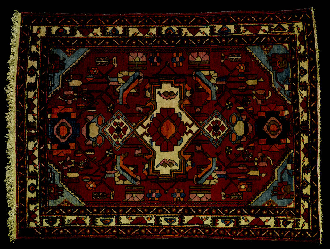 Tappeto a decorazione geometrica. Il campo esagonale presenta dei motivi decorativi di linea geometrica articolati attorno ad un medaglione centrale dalla forma quasi stellare. Nei quattro cantonali dal margine dentellato sono stati inseriti altri motivi stilizzati. La cornice è composta di una fascia centrale a fondo avorio e di due bordi laterali che alternano rosette a motivi geometrici.\nOrdito: cotone; Trama: cotone; Pelo: lana; Nodo: simmetrico; Densità: 900 nodi al dm2