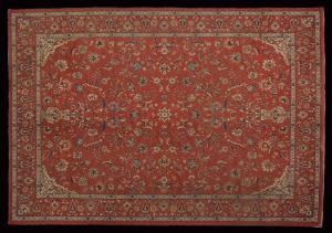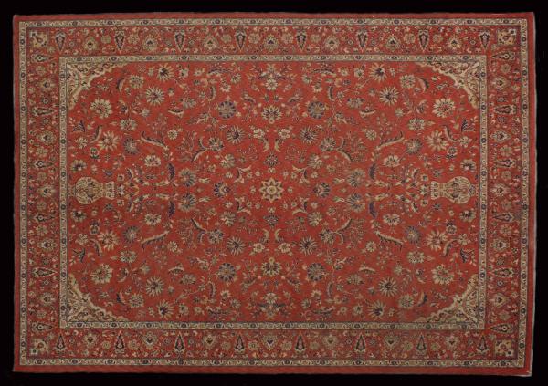 Tappeto a decorazione floreale. La decorazione del campo del tappeto è speculare sia rispetto all'asse verticale sia a quello orizzontale. La zona centrale del tappeto è costituita da una stella affiancata da due coppie di foglie dal profilo seghettato. Lungo i lati corti due vasi dai quali fuoriescono rametti fioriti e fogliati. Tutta la superficie è costellata da un mare di fiori e palmette di diverse dimensioni. I fiori si ripetono anche sul fondo beige dei quattro cantonali. La cornice è data da due sottili bordi con rosette collegate da tralci e da una fascia centrale abbastanza larga formata da palmette alternate a piccoli cipressi.\nIl tappeto in esame è stato attribuito all'ambito persiano ma con qualche dubbio dettato dall'assoluta mancanza di forza espressiva, dalla monotona simmetria e da una certa scipitezza della concezione complessiva. Il tappeto in esame è simile al tappeto inv. ISL 00313.\nOrdito: cotone; Trama: cotone; Pelo: lana; Nodo: asimmetrico; Densità: 2000 nodi al dm2 ca.