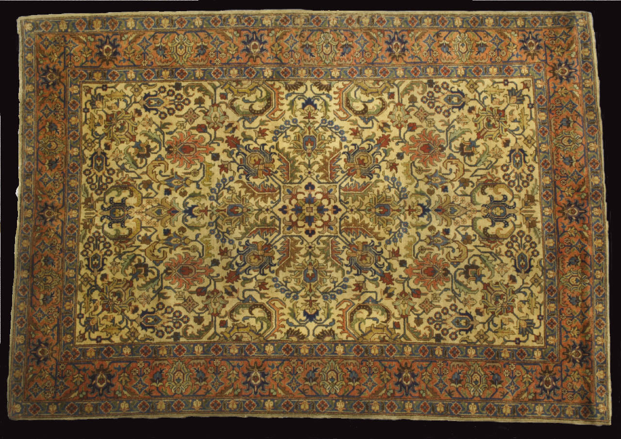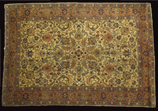 Tappeto con medaglione e decorazione floreale Il campo color crema del tappeto è decorato da un medaglione centrale ottenuto da grandi inflorescenze disposte simmetricamente attorno ad una stella centrale. Tutta la superficie rimanente è abitata da palmette stilizzate, boccioli, fioriture e foglie. La cornice è costituita da una fascia centrale ornata con una variante del e da due bordi laterali che presentano un identico motivo di fiorellini ripetuti. La fascia presenta palmette alternate a grandi fiori di vario disegno collegati da un intreccio di tralci fioriti e foglie. Il disegno essenziale, la semplicità decorativa, i colori pastello fanno pensare a un tappeto uscito dalle manifatture di Izmir (Smirne). In questa città, verso la fine dell'Ottocento furono impiantate grandi manifatture per la produzione di tappeti destinati in prevalenza al mercato occidentale. Attive soprattutto nei primi decenni del XX secolo, produssero esemplari con motivi d'ispirazione persiana dalle tinte pastello.\nOrdito: cotone; Trama: cotone; Pelo: lana; Nodo: asimmetrico; Densità: 1200 nodi al dm2 ca.