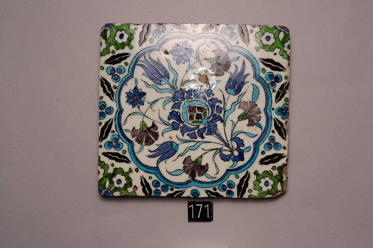 Mattonella quadrangolare decorata da un medaglione circolare polilobato contenente diagonalmente una peonia incorniciata da garofani, tulipani e margherite. Nei quattro angoli è presente una porzione di altre inflorescenze. I bordi sono occupati da due brevi linee ondulate sovrastate da tre sferette. Questo motivo, che prende il nome (sanscrito) di cintamani, fu particolarmente diffusonella Turchia d'età ottomana e considerato segno vittorioso oltre che potente amuleto.\n(un altro esemplare della stessa tipologia, scheda 46).