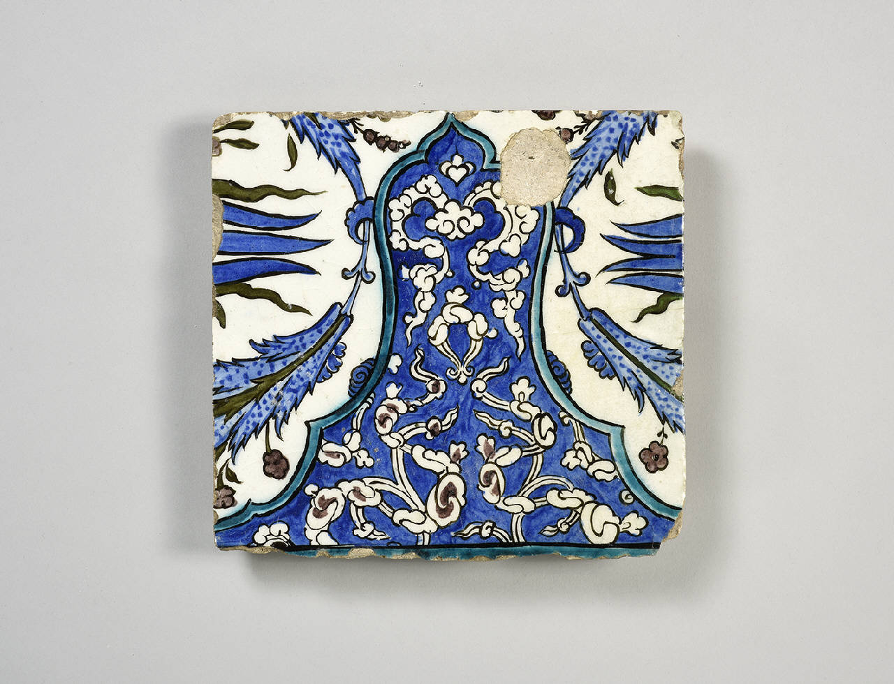 Mattonella quadrangolare dipinta in blu, turchese e verde salvia su fondo bianco sotto un'invetriatura trasparente. La decorazione consiste in una cartella polilobata abitata da tralci floreali, arabeschi e un motivo a nastri (chi-chi) di derivazione estremo orientale. La rimanente superficie è ornata da un motivo speculare comprendente due steli arcuati dai quali si dipartono minuti fiorellini color malva e porzioni di tulipani e foglie spigate (saz). Per la decorazione il presente manufatto può essere messo in relazione con la mattonella n. ISL 117.