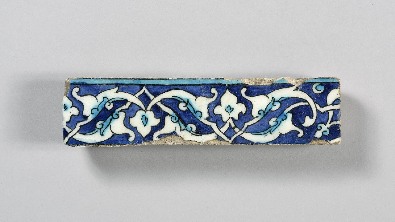 Mattonella di forma rettangolare, parte della cornice di un fregio, dipinta in blu, turchese e bianco sotto un'invetriatura trasparente. La decorazione consiste in un disegno ripetuto di gigli stilizzati entro rametti attorcigliati a girali e volute. \nPorta l'etichetta con iscrizione "n. 904".