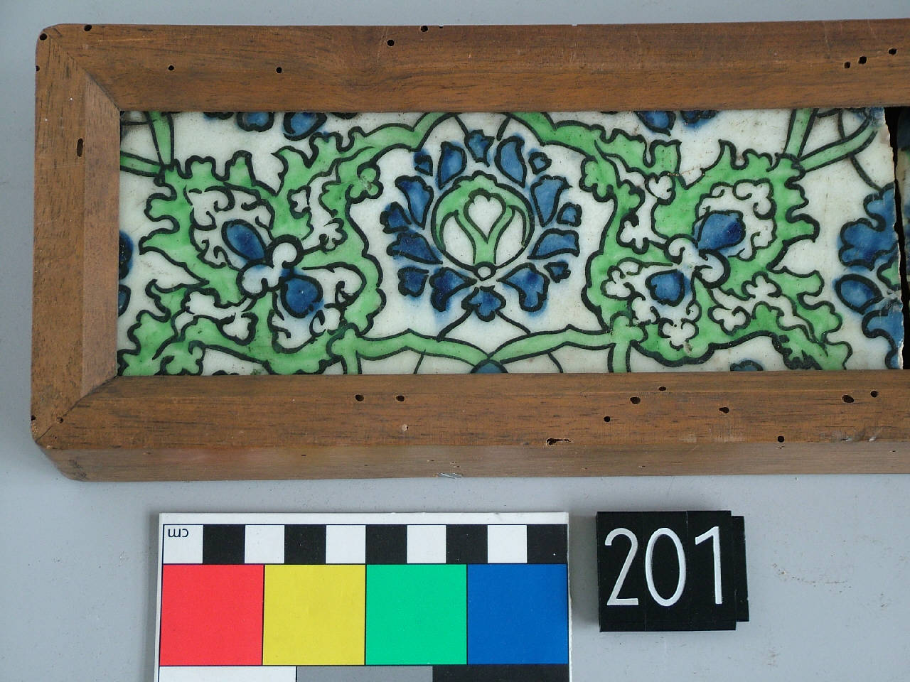 Coppia di mattonelle rettangolari dipinte in blu, verde chiaro, nero e bianco sotto un'invetriatura trasparente. La decorazione consiste in una palmetta centrale affiancata da racemi floreali e arabeschi. \nIn cornice con la mattonella inv. n. ISL 201.