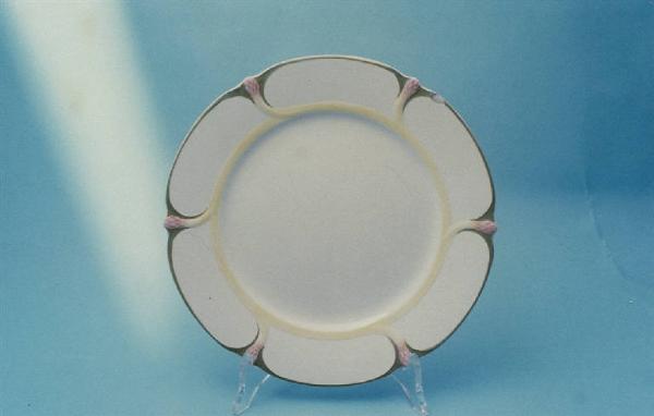 Piatto piano esalobato di colore bianco decorato con motivi liberty a rilievo. Colori: giallo, verde e rosa.