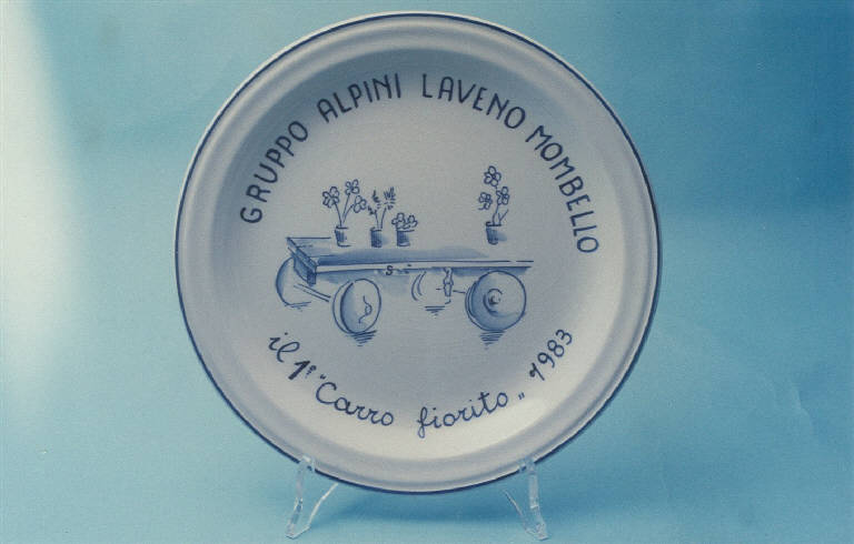 Piatto circolare; fondo bianco; tesa con profilatura blu; nel cavetto un carro fiorito con scritte "GRUPPO ALPINI LAVENO MOMBELLO/ il 1° Carro fiorito 1983"