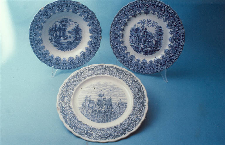 Piatto piano color avorio con bordo sagomato; decorato in decalcomania blu con al centro un paesaggio con architettura e sulla tesa una bordura a merletto.