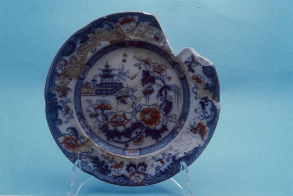 - NOTIZIE STORICO CRITICHE Il piatto è stato presumibilmente prodotto da una manifattura inglese nel corso del XIX secolo. Il decoro si apparenta infatti con le varie tipologie di piatti in terraglia inglese detti di gusto "indo-cinese", anche se il questo caso la dicromia rosso-blu e la stesura sfumata dei pigmenti creano un'immagine dissonante rispetto alla produzione corrente. L'iscrizione "Mooltan", letta a tergo del piatto, indicherebbe la città indiana del Punjab e forse si riferisce alla denominazione del decoro.