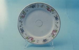 Piatto da frutta circolare; fondo bianco con motivo decorativo floreale policromo (fiorellini e rose) lungo l'ala; bordo rifinito con filettatura oro.