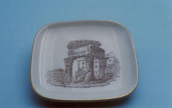 Posacenere di forma quadrata; fondo bianco con veduta del Tempio di Giove Tonante al centro; angoli arrotondati; bordo rifinito con filettatura oro.