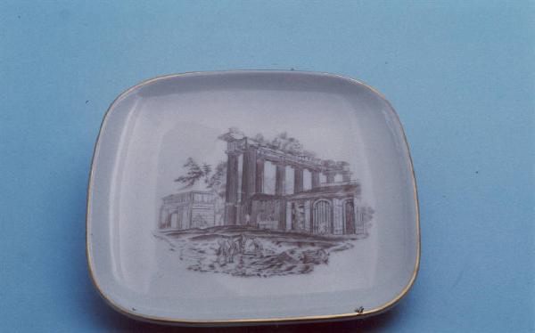 Posacenere di forma quadrata; fondo bianco con veduta del Tempio della Concordia a Roma al centro; angoli arrotondati; bordo rifinito con filettatura oro.