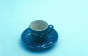 - NOTIZIE STORICO CRITICHE La coloritura blu cobalto è eseguita sottosmalto mentre il motivo decorativo floreale presente sia sulla tazza che sul piattino è realizzato a rilievo in bianco e oro. L'oggetto schedato rientra in una tipologia di vaselllame ampiamenente diffusa tra la fine dell'Ottocento e l'inizio del Novecento. Il numero finale presente nel punzone a tergo del piattino potrebbe indicare la data di fabbricazione (1900): in mancanza di dati certi si preferisce mantenere una data generica. Il piattino è privo di numero di inventario.
