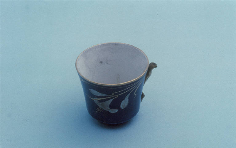 Tazza da caffè con corpo leggermente svasato; restringimento in prossimità del piede; decoro con disegni floreali (gigli) in bianco e oro su fondo blu cobalto; bordi rifiniti con filettatura oro; bianco internamente.