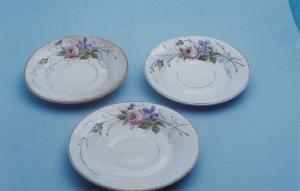 Piattino circolare; fondo bianco avorio con mazzo di fiori policromo in posizione decentrata sul fondo; bordo rifinito con filettatura oro.