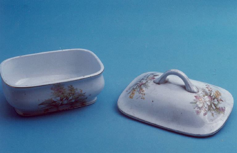 Portasapone con coperchio; angoli arrotondati; restringimento in prossimità del piede; decoro floreale (orchidee e primule) policromo sia cul contenitore che sul coperchio; fondo bianco avorio; bordi rifiniti con filettatura oro.