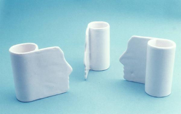Serie di diciotto portapenne formati da un recipiente a forma cilindrica che si prolunga lateralmente con un'aletta avente il profilo di un volto umano; fondo bianco uniforme.