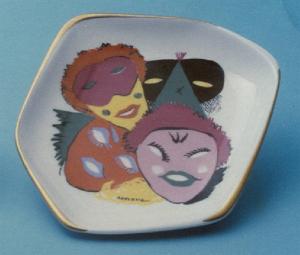 - NOTIZIE STORICO CRITICHE Alla metà del Novecento Guido Andlovitz, direttore artistico della Società ceramica Italiana dal 1923 al 1961, si cimentò in alcune decorazioni per posaceneri (cfr. anche nn. inv. 1387, 1474) ispirate al motivo delle maschere carnevalesche, sviluppando un genere introdotto negli anni '30. L'oggetto in esame rientra in una cospicua serie di posacenere in porcellana realizzata nello stabilimento Verbano per la ICAT di Torino.\nIl decoro e il posacenere compaiono nei cataloghi dello stabilimento Verbano custoditi presso archivio della SCI con numero 4275 per quanto riguarda il decoro (busta 85, fascicolo 2 e busta 85, fascicolo 1) e numero 10121 per quanto riguarda il posacenere (busta 85, fascicolo 1).