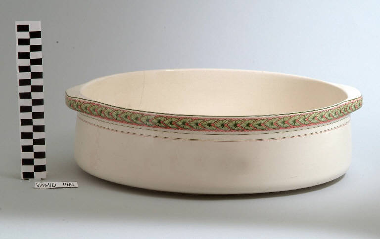 Catino lavamano cilindrico con maniglie sporgenti; fondo bianco con motivo a foglie d'edera in verde e rosa all'esterno; bordo rifinito con filettatura verde.