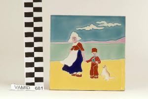 Piastrella quadrata; fondo bianco decorato con donna olandese con bambino e cane in rosa, azzurro, rosso, blu e giallo.