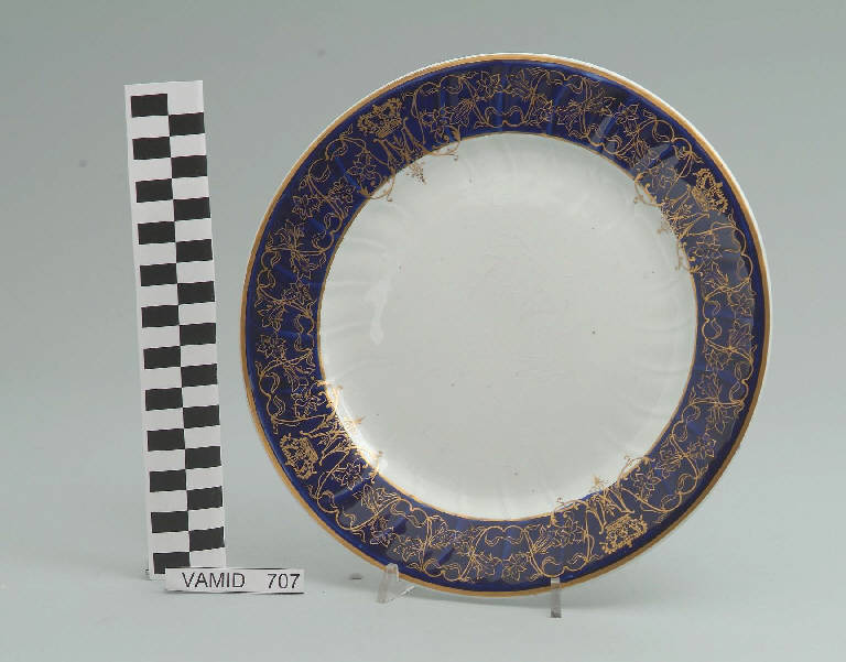 Piatto piano circolare; fondo bianco con tesa in color blu Sevrès con motivi vegetali e corona del Regno d'Italia in oro; bordo rifinito con filettatura oro.