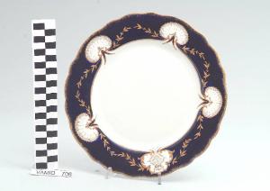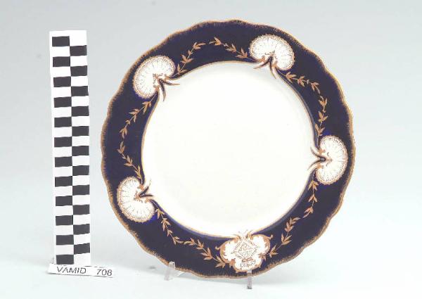 Piatto piano con orlo festonato; fondo bianco con tesa in color blu Sevrès con motivi a valva di conchiglia e corona della regina Margherita in bianco e oro; bordo rifinito con filettatura oro.