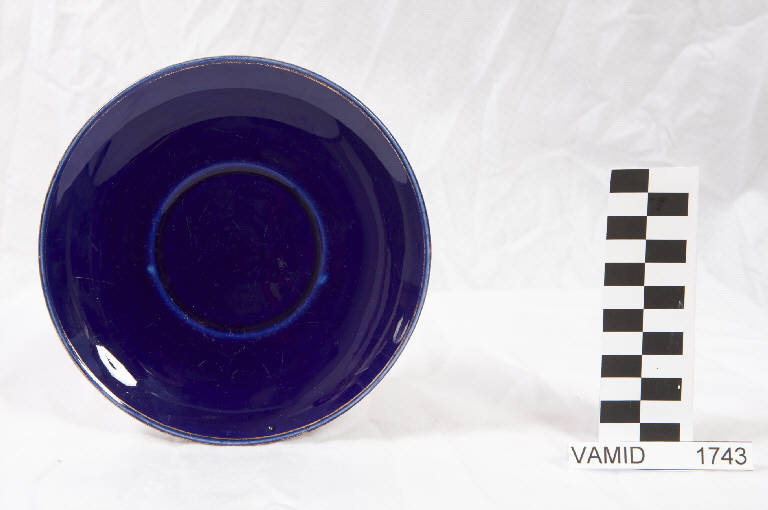 Piattino circolare; fondo blu cobalto; bordo rifinito con filettatura oro.